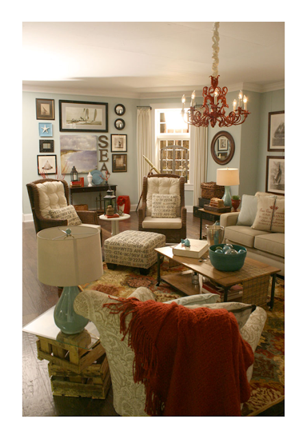I'm completely in love with this eclectic style - from the ottomans covered in words to the crates for an end table! These colors do not go with my living room style at all, but I am looking frantically for ways to implement some of these ideas in my home. The wall color here, however, does match my kitchen...so....I'm thinking of painting the chandelier/light fixture over the kitchen table RED!